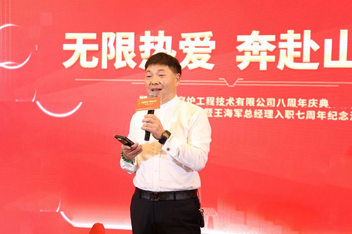 集團(tuán)董事長楚科奇首先發(fā)表了致辭。他回顧了榮盛窯爐工程八年來從創(chuàng)業(yè)維艱到行業(yè)頭部的奮斗歷程。他指出,每一份成績的取得,都凝聚著全體員工的智慧、汗水與“無限熱愛”。楚總向入職七周年的王海軍總經(jīng)理表達(dá)敬意與感謝,高度評價,擁有 領(lǐng)導(dǎo)力和市場洞察力。他特別強(qiáng)調(diào),在王總的帶領(lǐng)下,工程公司今年業(yè)績超越預(yù)期,創(chuàng)下歷史新高,為公司樹立了新的發(fā)展標(biāo)桿。同時,楚總也對朱廣州帶領(lǐng)的工程項(xiàng)目部、白建偉負(fù)責(zé)的生產(chǎn)部以及集團(tuán)管理層表達(dá)了充分肯定,感謝各團(tuán)隊(duì)為公司發(fā)展作出的重要貢獻(xiàn)。最后,楚總號召全體榮盛人,以八周年為新的起跑線,憑借對事業(yè)的無限熱愛與堅(jiān)定信念,共同驅(qū)動榮盛巨輪,在時代的浪潮中破浪前行,開辟更加壯麗的征途。